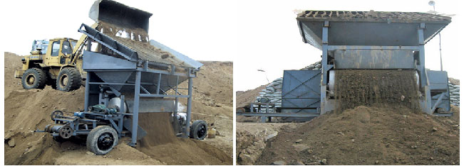 從河床提取的河沙加水后,進(jìn)入格篩,篩去粗大石塊后,進(jìn)入帶有勻礦板的槽體,再次經(jīng)加水稀釋、漂洗的沙漿均勻的給到滾筒表面具有高磁力的選別區(qū)。其中較高品位的鐵沙被高磁力吸附于筒體表面,并被旋轉(zhuǎn)的筒體輸送到下部的洗沙區(qū),經(jīng)沖洗水沖掉附帶的河沙后被輸送到精礦區(qū),由水流沖到鐵沙收集槽,成為高品位的鐵沙。而其中非磁性泥沙,則不受磁力作用直接進(jìn)入尾礦槽排出。由此達(dá)到提取鐵粉的目的。