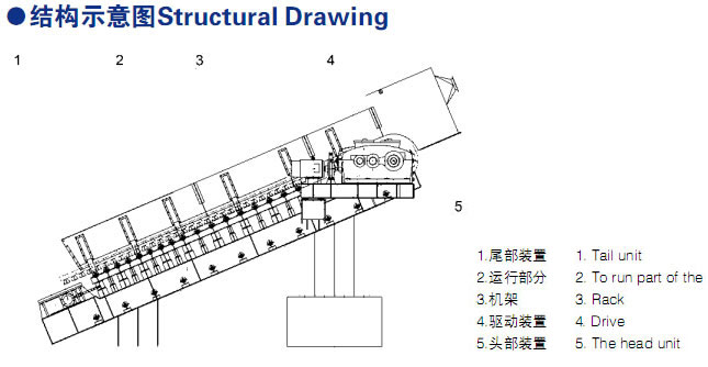 2、料槽: 整個料槽圍成一個相對封閉的箱體,以保證上部來料能夠有效進入板鏈上部,便于物料自開口處由刮板輸送至下一級輸送系統(tǒng),同時保證不使物料散落。